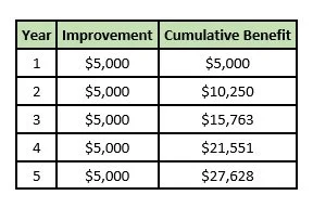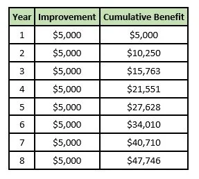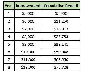 We can play with this calculation a bit too – say we can improve the improvements by an extra $1,000 a year: