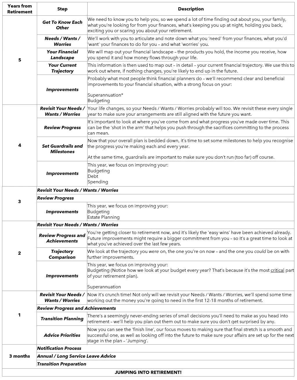 (Now, this structure assumes that you’ve done the right things for the bulk of your working life – lived within your means, put money into super when possible, paid down debt, invested a little bit here and there. In other words, you’ve already laid the foundation. If that’s not the case, then I believe our role should start much earlier – as soon as you’re ready to, really.)
